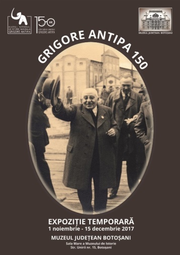 Muzeul Judeţean Botoșani, în colaborare cu Muzeul Naţional de Istorie Naturală „Grigore Antipa”, vă invită miercuri, 1 noiembrie 2017, ora 13.00, în Sala Mare a Muzeului de Istorie Botoşani, la vernisajul expoziţiei temporare „Grigore Antipa-150”.
