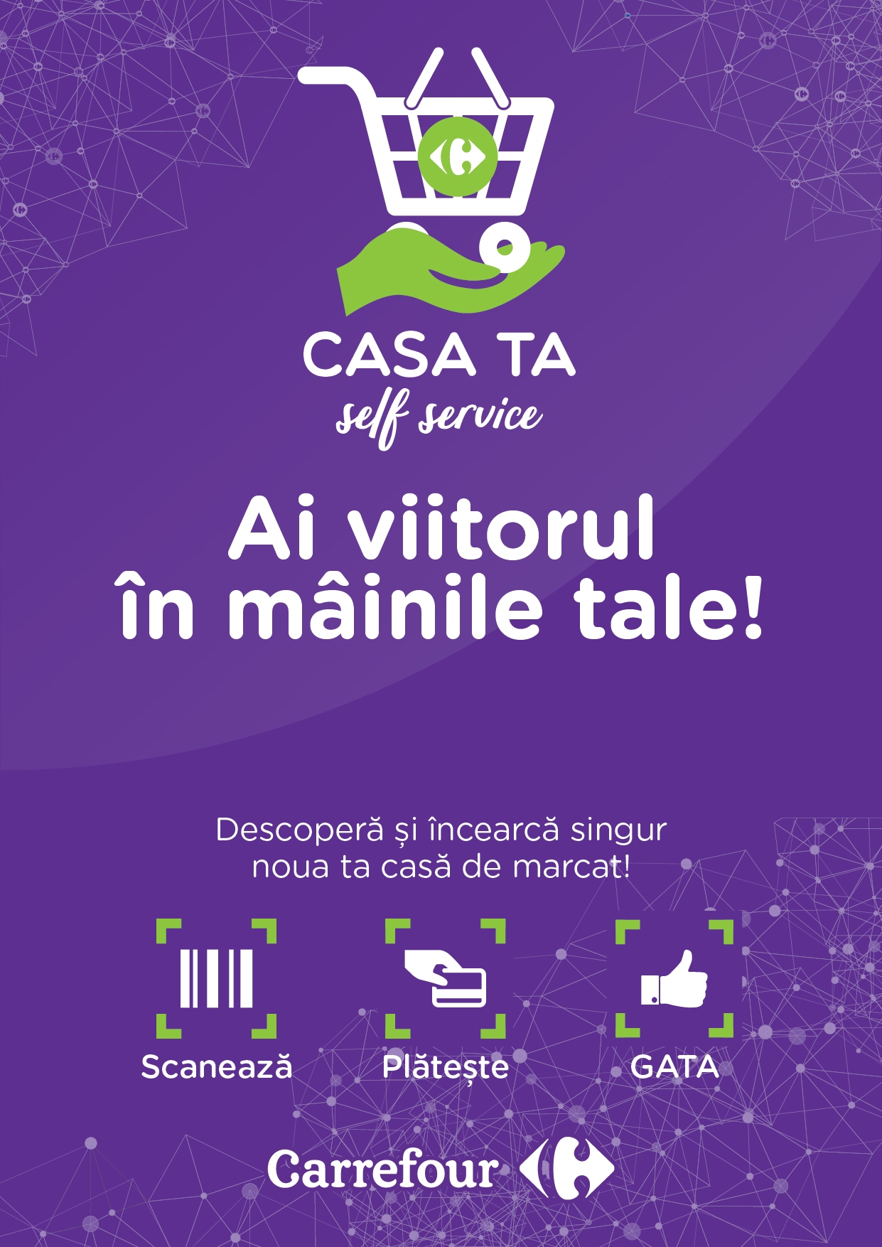 Carrefour România a lansat pe 21 August, in hipermarketul Carrefour Baneasa, serviciul integrat „Casa ta – Self Service”, prima casa de marcat unde clientii au posibilitatea de a scana si plati singuri, in acelasi loc, produsele cumparate.