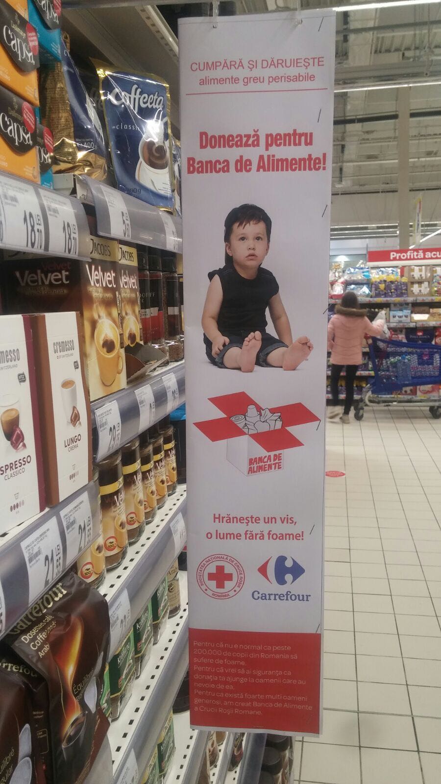 Astfel, in perioada 10 Aprilie-10 Mai, oamenii pot dona alimente greu perisabile sau bani pentru persoanele și familiile defavorizate, prin intermediul urnelor special amplasate la casele de marcat și la ieșirea din magazine, iar zeci de voluntari de Cruce Roșie din toată țara vor promova campania în rândul clienții magazinelor și ii vor invita să doneze un aliment pentru cei care suferă de foame