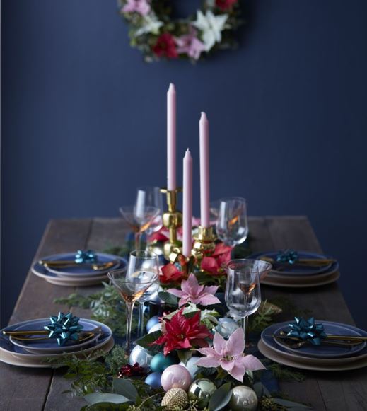 Dă mesei tale un plus de strălucire festivă cu o idee de decorațiune: mini crăciunițe și lumânări roz pe un pat de ierburi proaspăt tăiate. Alătură-le unor globuri de crăciun și altor accesorii de Crăciun. Poți adauga și câteva crenguțe de eucalipt. Eucaliptul este foarte popular și adaugă o valență unică decorațiunilor tale.