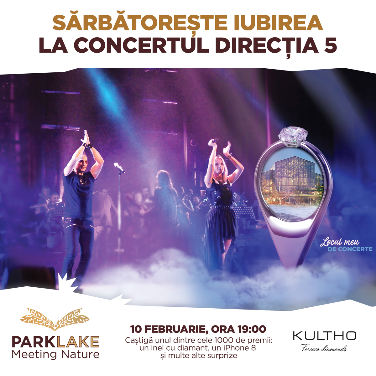 Pe data de 10 februarie, începând cu ora 19:00, cuplurile prezente în centrul comercial vor putea asculta live cele mai cunoscute, dar și cele mai noi melodii ale trupei Direcția 5. Concertul va avea loc la parter, în zona Main Square, iar finalul acestuia va fi marcat de 1 000 de baloane roșii eliberate deasupra publicului. Dar surprizele nu se opresc aici! Participanții la eveniment vor avea șansa să câștige unul dintre premiile oferite de magazinele partenere și ascunse în interiorul baloanelor, precum și premiul cel mare – un inel cu diamant Salvini, oferit de magazinul Kultho și un telefon iPhone 8.