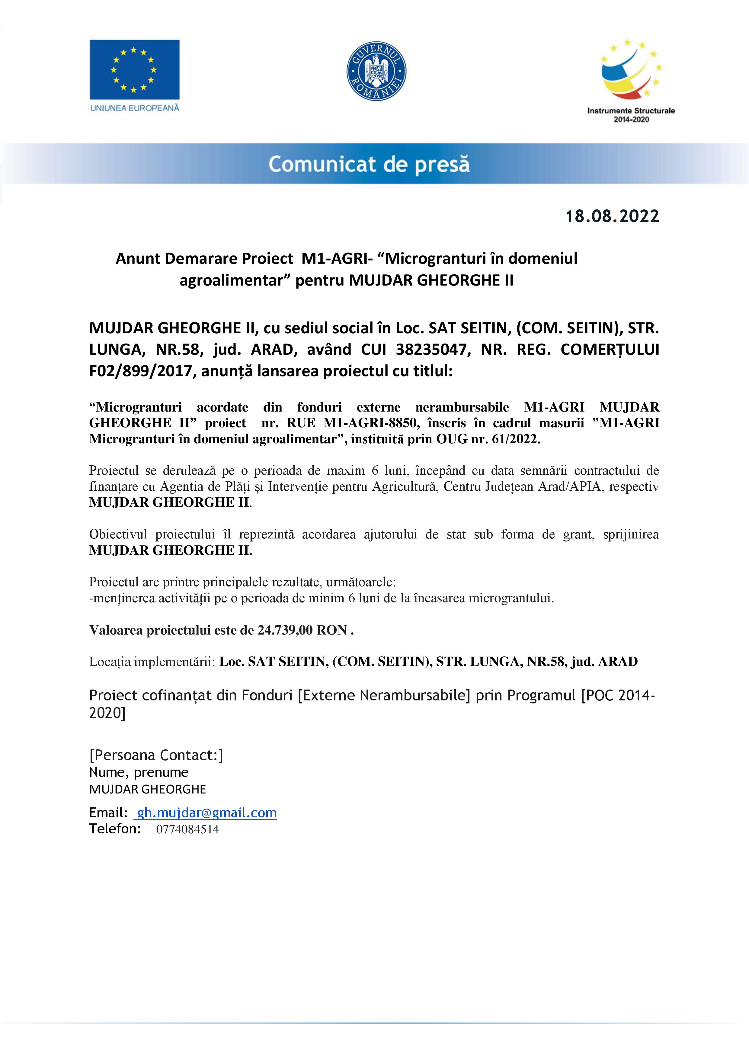 “Microgranturi acordate din fonduri externe nerambursabile M1-AGRI MUJDAR GHEORGHE II” proiect nr. RUE M1-AGRI-8850, înscris în cadrul masurii ”M1-AGRI Microgranturi în domeniul agroalimentar”, instituită prin OUG nr. 61/2022.
