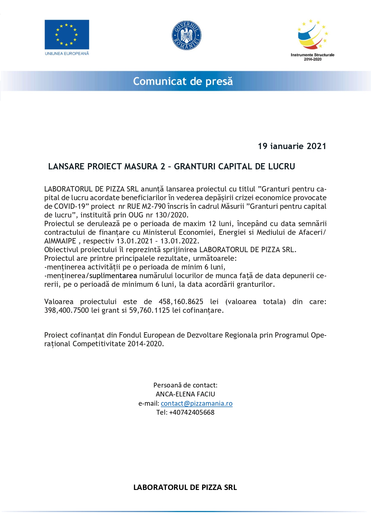LABORATORUL DE PIZZA SRL anunță lansarea proiectul cu titlul ”Granturi pentru capital de lucru acordate beneficiarilor în vederea depășirii crizei economice provocate de COVID-19” proiect nr RUE M2-790 înscris în cadrul Măsurii ”Granturi pentru capital de lucru”, instituită prin OUG nr 130/2020.