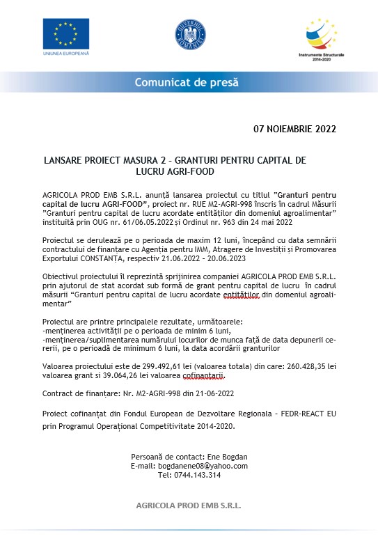 AGRICOLA PROD EMB S.R.L. anunță lansarea proiectul cu titlul ”Granturi pentru capital de lucru AGRI-FOOD”, proiect nr. RUE M2-AGRI-998 înscris în cadrul Măsurii ”Granturi pentru capital de lucru acordate entităților din domeniul agroalimentar” instituită prin OUG nr. 61/06.05.2022 și Ordinul nr. 963 din 24 mai 2022