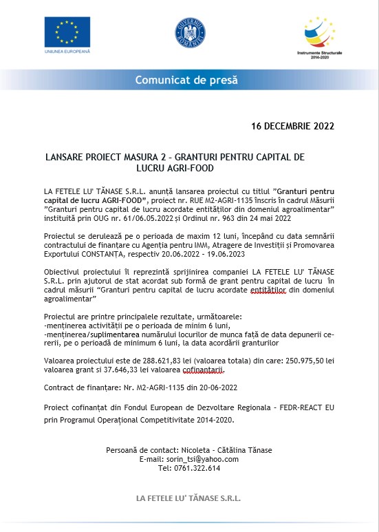 LA FETELE LU’ TĂNASE S.R.L. anunță lansarea proiectul cu titlul ”Granturi pentru capital de lucru AGRI-FOOD”, proiect nr. RUE M2-AGRI-1135 înscris în cadrul Măsurii ”Granturi pentru capital de lucru acordate entităților din domeniul agroalimentar” instituită prin OUG nr. 61/06.05.2022 și Ordinul nr. 963 din 24 mai 2022