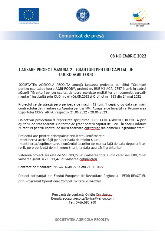 SOCIETATEA AGRICOLA RECOLTA anunță lansarea proiectul cu titlul ”Granturi pentru capital de lucru AGRI-FOOD”, proiect nr. RUE M2-AGRI-2757 înscris în cadrul Măsurii ”Granturi pentru capital de lucru acordate entităților din domeniul agroalimentar” instituită prin OUG nr. 61/06.05.2022 și Ordinul nr. 963 din 24 mai 2022