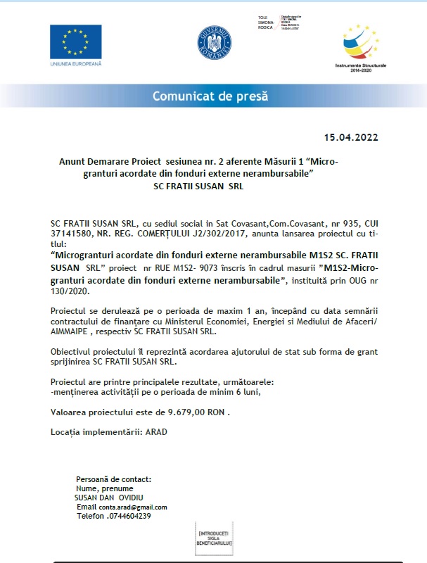 Lansare proiect „Microgranturi acordate din fonduri externe nerambursabile M1S2 SC FRATII SUSAN SRL