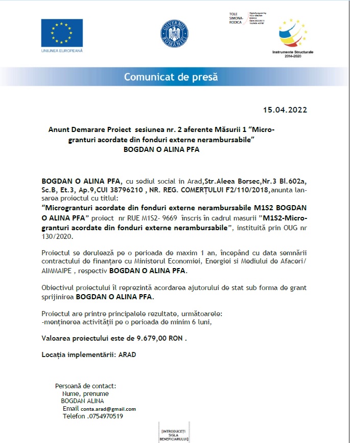 Lansare proiect "Microgranturi acordate din fonduri externe nerambursabile M1S2 BOGDAN O ALINA PFA