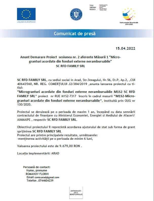 Lansare proiect "Microgranturi acordate din fonduri externe nerambursabile M1S2 SC RFD FAMILY SRL
