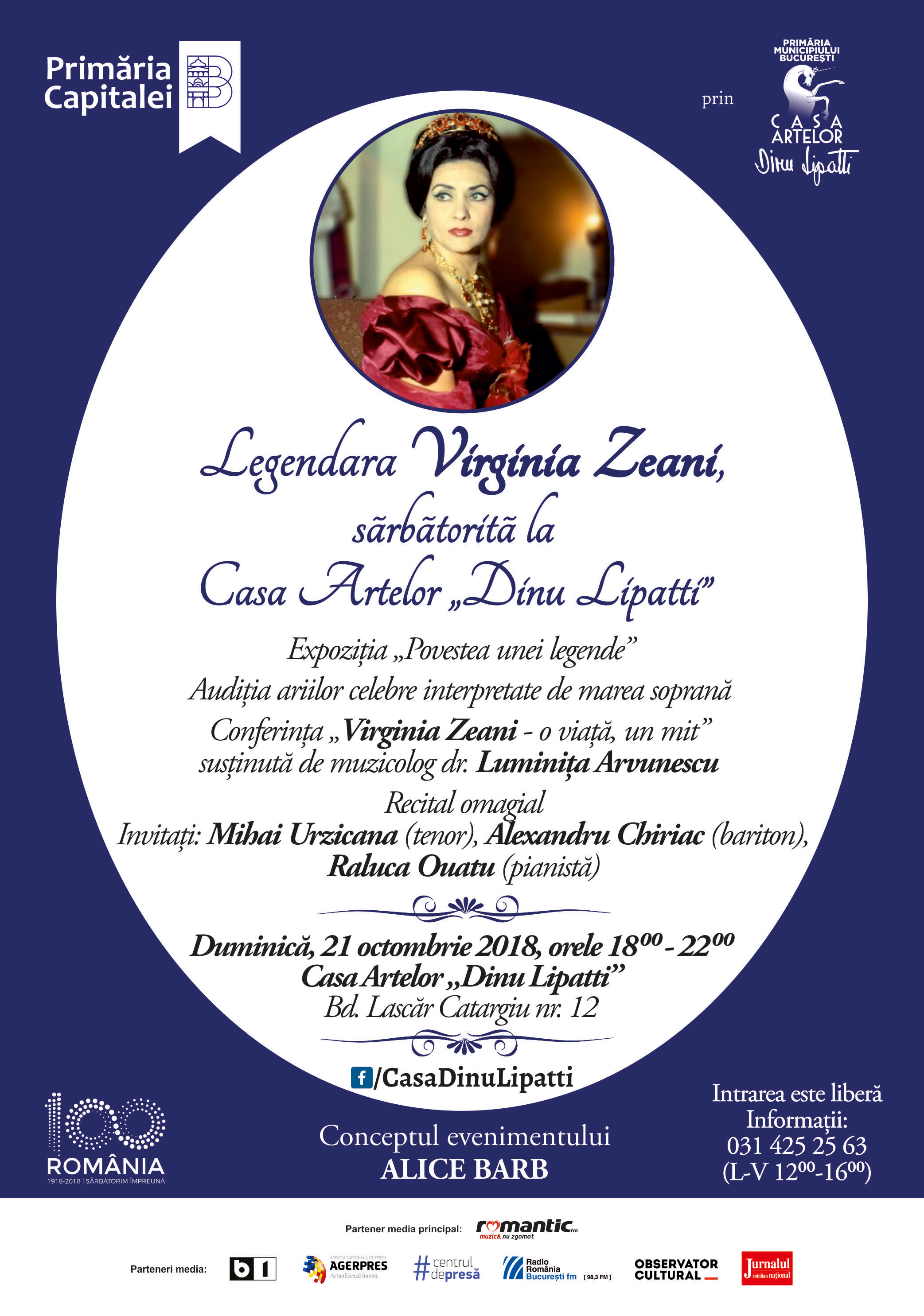 Primăria Municipiului București prin Casa Artelor „Dinu Lipatti” vă invită duminică, 21 octombrie 2018, la evenimentul extraordinar “Legendara Virginia Zeani, sărbătorită la Casa Artelor <<Dinu Lipatti>>”, eveniment care celebrează cea de-a 93-a aniversare a celebrei soprane românce!