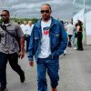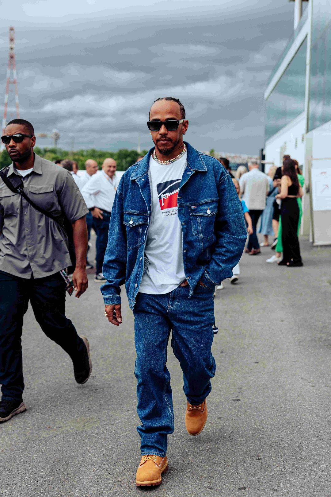 Lewis Hamilton a purtat jacheta supradimensionată Aiden din denim, combinată cu blugi baggy carpenter, ambele din colecția Archive. A desăvârșit look-ul cu un tricou alb supradimensionat cu steagul TOMMY JEANS.