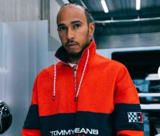 Lewis Hamilton a fost văzut purtând un hanorac cu fermoar oversized, cu imprimeu colorblocked, în roșu și bleumarin, din colecția TOMMY JEANS Summer Pre-Fall 2023, asortat cu blugi baggy light wash din colecția Primăvară 2023.