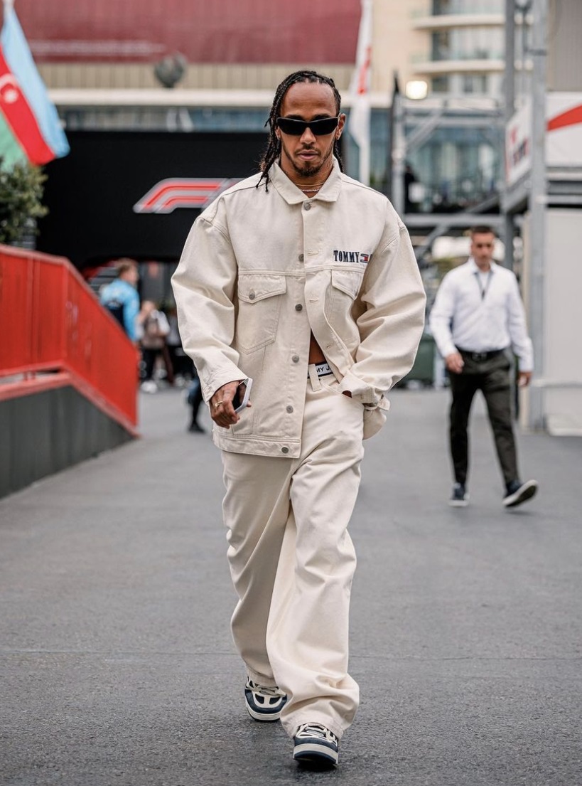 Lewis Hamilton, pilot de Formula 1 Mercedes-AMG Petronas, a purtat produse din colectia TOMMY JEANS Primavara 2023 la Baku Grand Prix din Azerbaidjan pe 30 aprilie 2023.