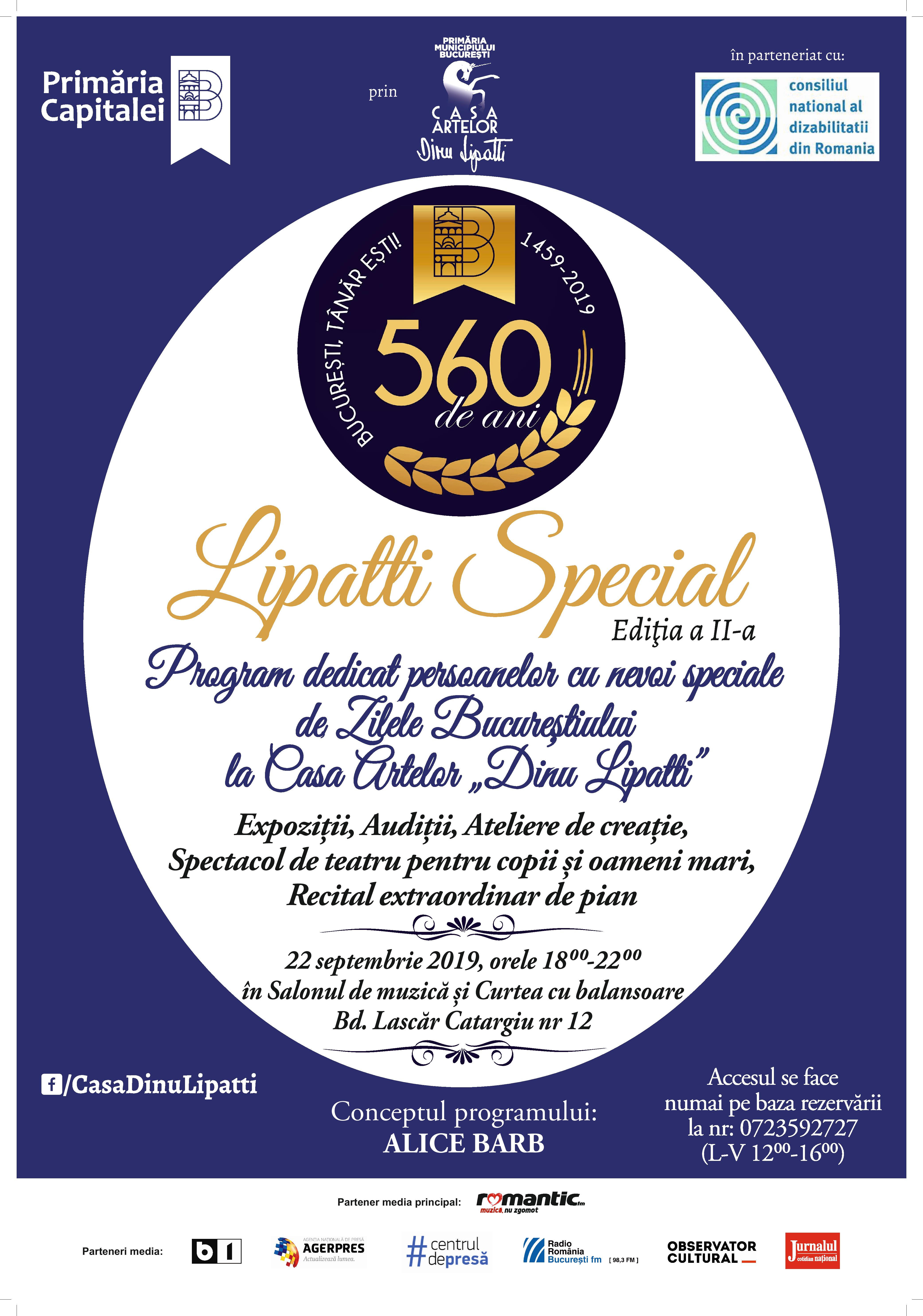 Primăria Municipiului Bucureşti prin Casa Artelor „Dinu Lipatti”, în parteneriat cu Consiliul Național al Dizabilității din România organizează, duminică, 22 septembrie 2019, începând cu orele 18:00, cea de-a II-a Ediție a programului cultural LIPATTI SPECIAL – program dedicat persoanelor cu nevoi speciale.