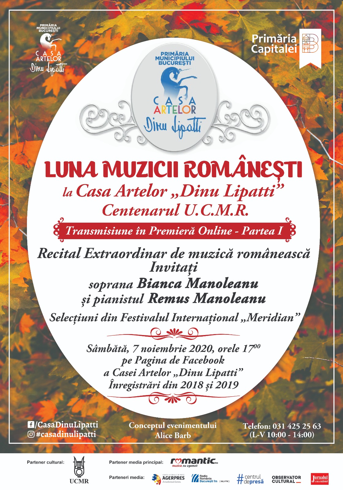 În luna noiembrie, Casa Artelor „Dinu Lipatti” celebrează împlinirea unui secol de existență a Societății Compozitorilor Români, devenită în 1949 Uniunea Compozitorilor și Muzicologilor Români, Societate din care a făcut parte, cu mare onoare, și mentorul nostru spiritual, pianistul, compozitorul și pedagogul Dinu Lipatti. În semn de prețuire și recunoaștere, Casa Artelor „Dinu Lipatti” a intitulat luna noiembrie „Luna Muzicii Românești”, toate Premierele Online transmise în următoarele patru week-end-uri fiind dedicate compozitorilor și interpreților români.
