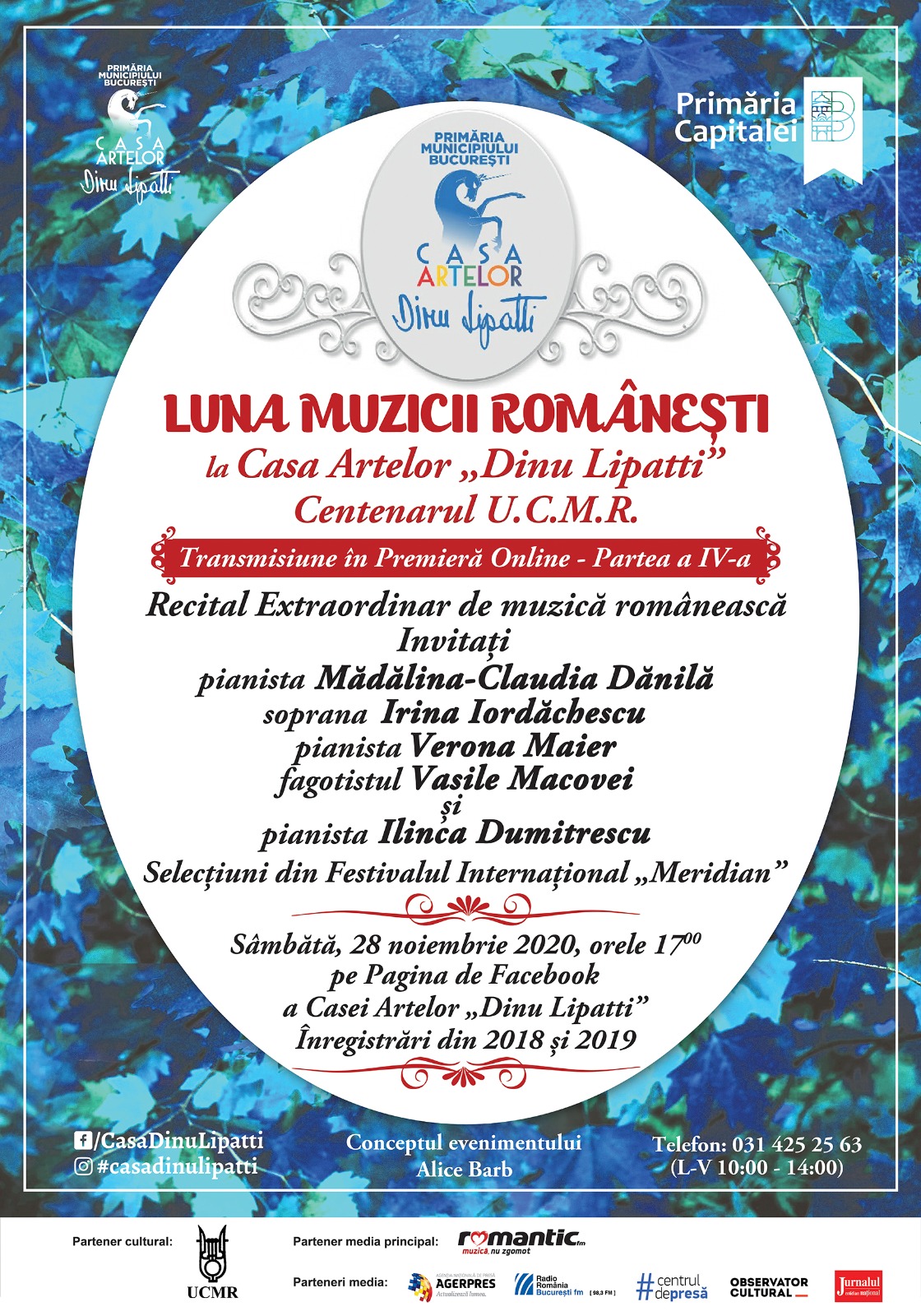 Sâmbătă, 28 noiembrie, de la orele 17:00, vă oferim Selecțiuni din Festivalul Internațional „Meridian” la Casa Artelor „Dinu Lipatti”, Înregistrări din anii 2018 și 2019, într-un Recital Extraordinar de Muzică Românească în care îi veți putea revedea în Premieră Online pe pagina noastră de Facebook pe pianista Mădălina-Claudia Dănilă, soprana Irina Iordăchescu, pianista Verona Maier, pianista Ilinca Dumitrescu și fagotistul Vasile Macovei.