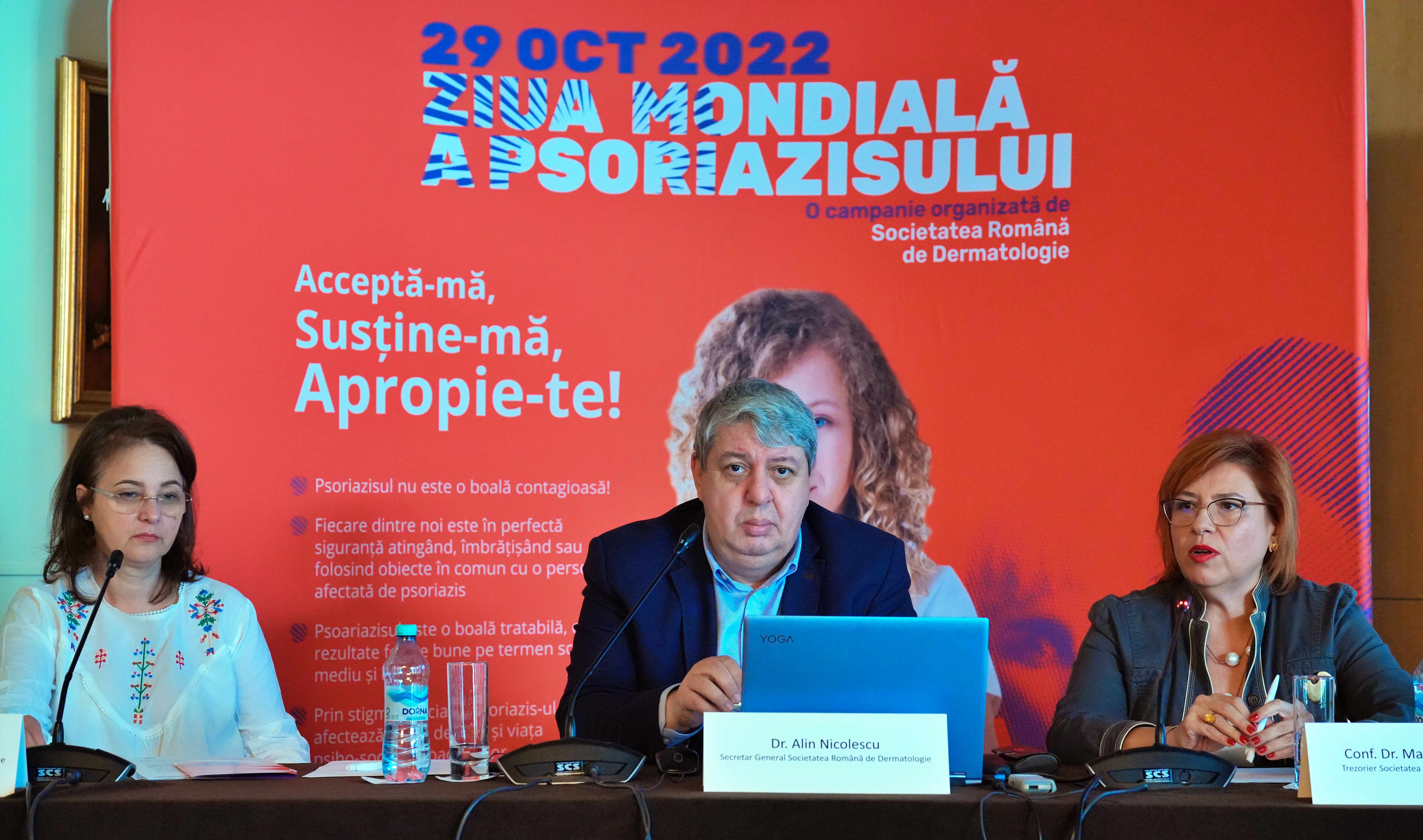 „Unul dintre principalele noastre obiective este să creștem procentul de diagnosticare și tratare corectă a celor afectați de psoriazis. Cu tratamentul corect, putem îmbunătăți calitatea vieții pacienților și asigura integrarea lor socio-profesională. În acest moment, pacienții cu psoriazis moderat și sever din România beneficiază în mod gratuit de terapiile biologice disponibile la nivel mondial. De asemenea, este foarte important să transmitem oamenilor că psoriazisul nu este o boală contagioasă și cei care sunt afectați de ea nu trebuie stigmatizați și izolați. Fiecare dintre noi este în perfectă siguranță atingând, îmbrățișând sau folosind obiecte în comun cu o persoană afectată de psoriazis.” spune Dr. Alin Nicolescu, Secretar General al Societății Române de Dermatologie.