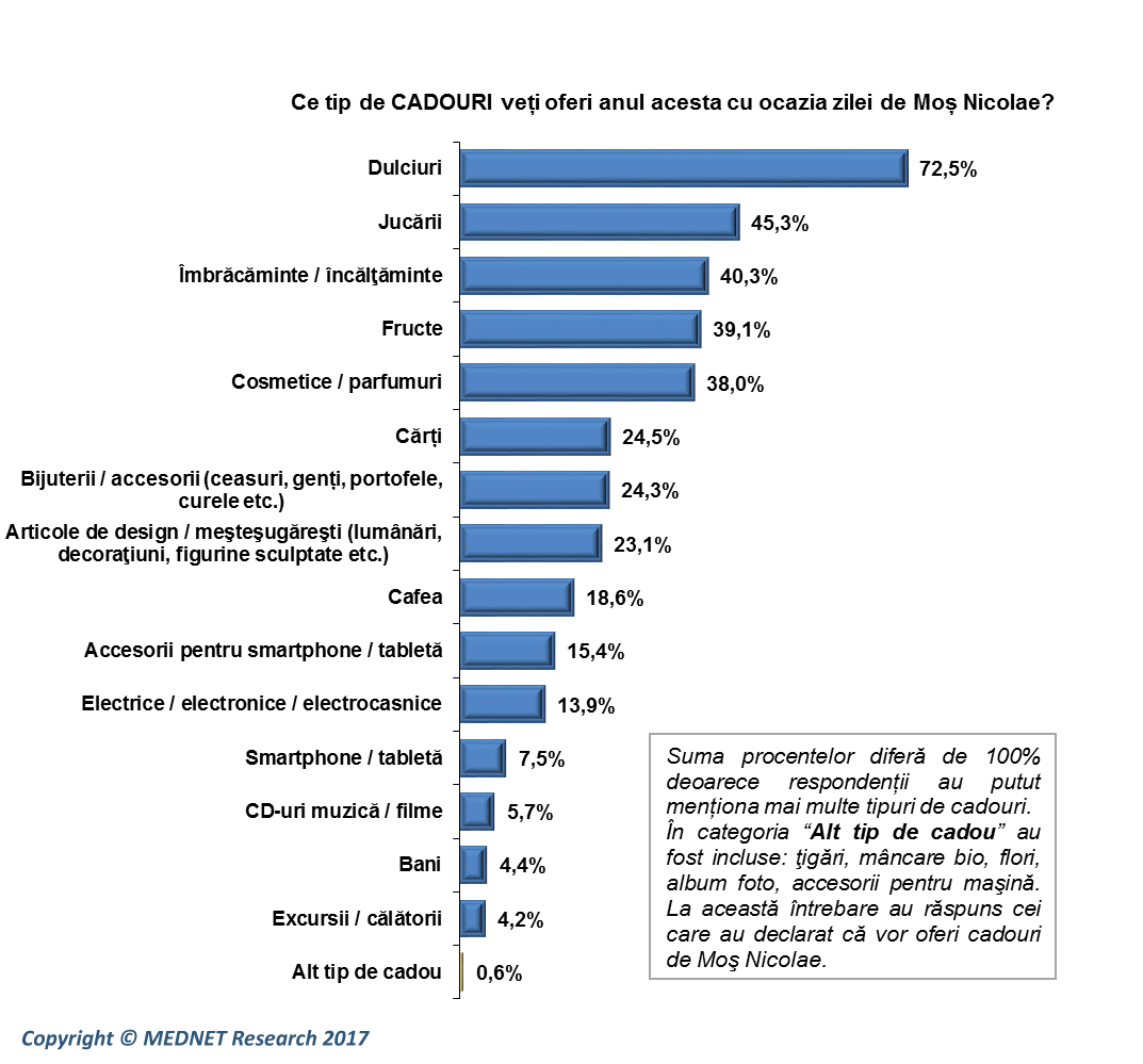 Conform datelor celui mai recent studiu de piață realizat de către MEDNET Marketing Research Center, intenția de a face cadouri de Moș Nicolae este foarte mare, fiind tot mai ridicată de la an la an.