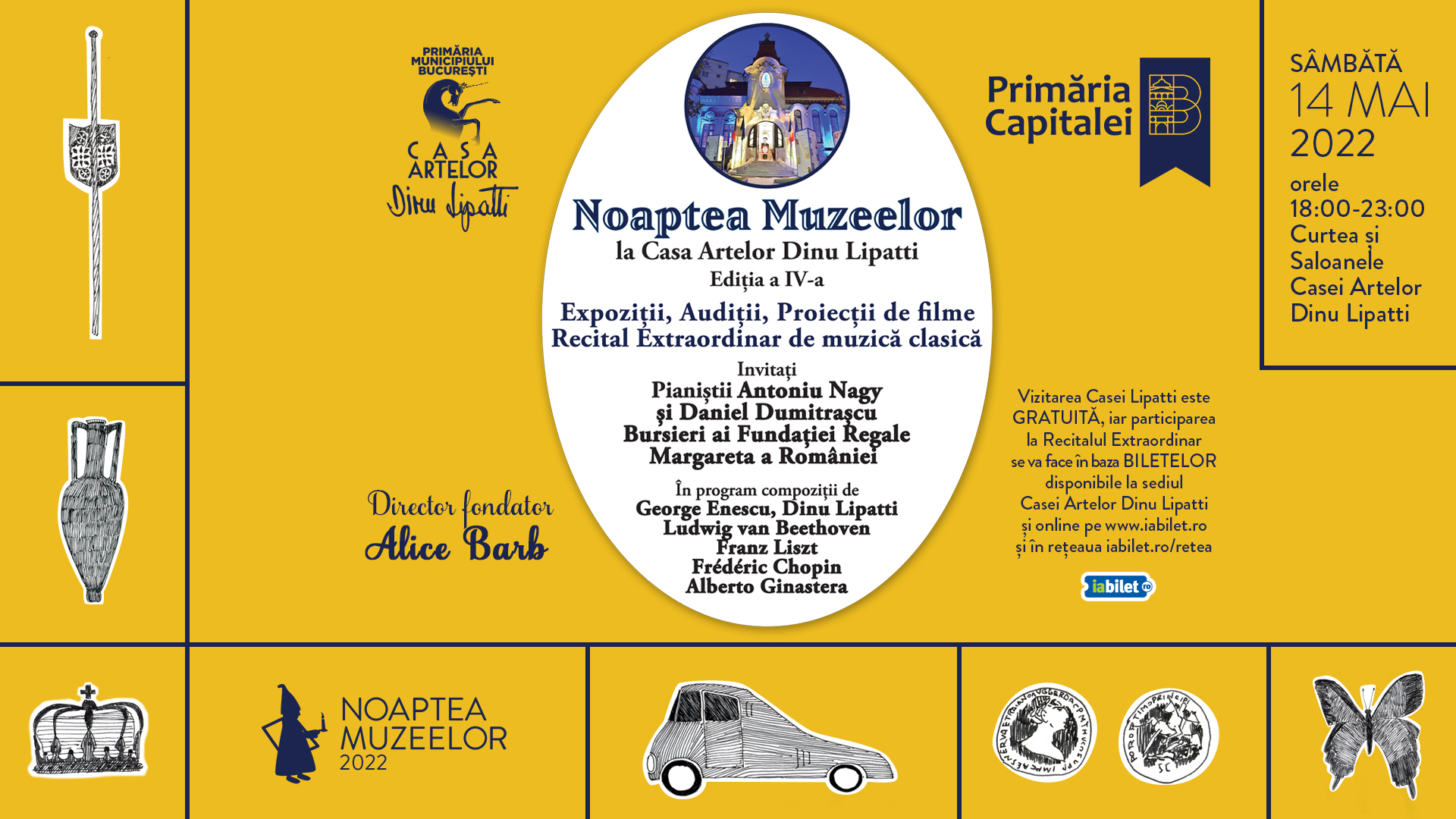 Casa Artelor Dinu Lipatti vă invită sâmbătă, 14 mai 2022, între orele 18:00 și 23:00, să descoperiți și să redescoperiți Casa în care a locuit genialul pianist și compozitor Dinu Lipatti împreună cu familia sa și să vă bucurați de emoția muzicii, la Evenimentul „Noaptea Muzeelor la Casa Artelor Dinu Lipatti”.