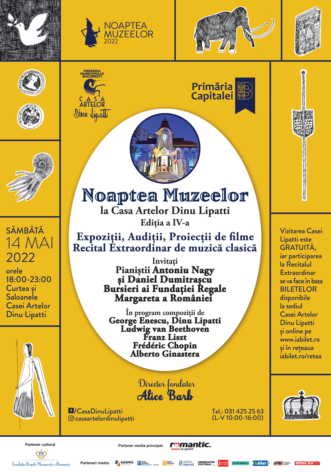 Evenimentul cultural propus și realizat în parteneriat cu Rețeaua Națională a Muzeelor din România la care Casa Artelor Dinu Lipatti participă pentru a patra oară, îi are invitați în acest an ca parteneri culturali pe Fundația Regală Margareta a României. Programul acestei ediții va cuprinde vizitarea Casei Lipatti, Expoziții, Recital Extraordinar de pian și Proiecții de filme despre viața și opera celui mai mare pianist român al tuturor timpurilor, Dinu Lipatti.
