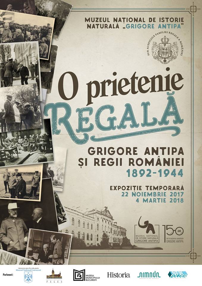 Muzeul Național de Istorie Naturală „Grigore Antipa” împreună cu partenerii săi – Muzeul Național Cotroceni, Muzeul Național Peleș și Muzeul Municipiului București – vă invită miercuri, 22 noiembrie 2017, ora 18.00, la vernisajul expoziției temporare intitulată „O Prietenie Regală: Grigore Antipa și Regii României 1892-1944”. Acest eveniment, organizat sub auspiciile Familiei Regale a României, se înscrie în seria numeroaselor evenimente organizate de Muzeu în acest an, pentru a marca 150 de ani de la nașterea lui Grigore Antipa.