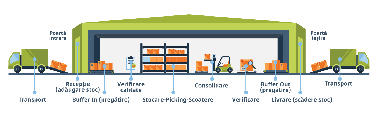 - Management complet automat al operațiunilor de depozitare cu orice grad de complexitate