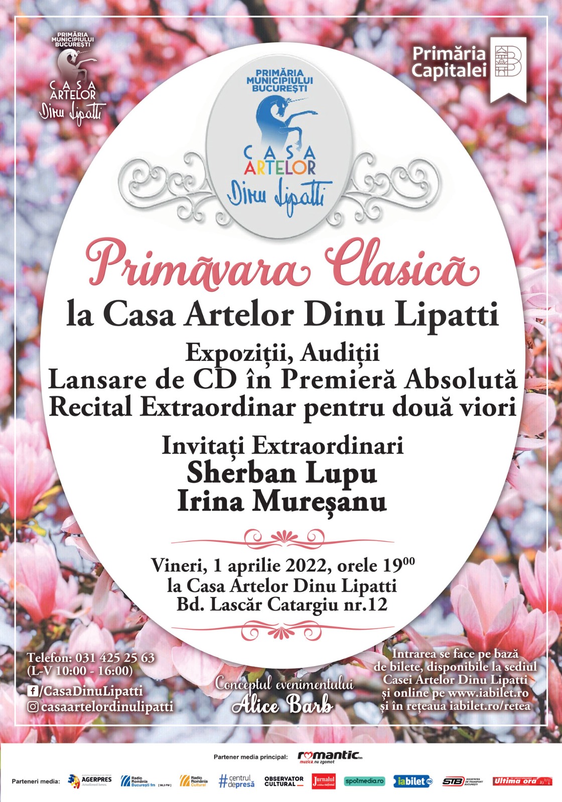 Casa Artelor Dinu Lipatti vă invită vineri, 1 aprilie 2022, la evenimentul „Primăvara Clasică” în cadrul căruia puteți participa la Expoziții și Audiții, Lansare de CD în Premieră absolută, Conferiță și Recital Extraordinar pentru două viori susținut de Invitații noștri – violoniștii Sherban Lupu și Irina Mureșanu.