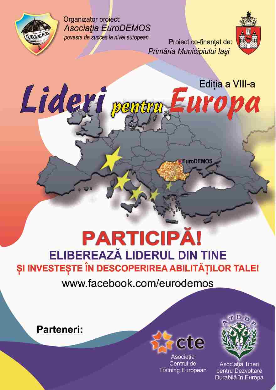 Proiectul Lideri pentru Europa, aflat la a VIII-a ediție, are ca scop susținerea dialogului civic și creșterea conștientizării colective privind importanța implicării active în comunitatea locală, dezvoltarea competențelor civice în rândul tinerilor și cunoașterea procesului decizional local în contextul dezvoltării democratice a comunității locale. Proiectul este cofinanțat de Primăria Municipiului Iași în acord cu prevederile legii 350/2005 privind regimul finanțărilor nerambursabile din fonduri publice alocate pentru activități nonprofit de interes general.