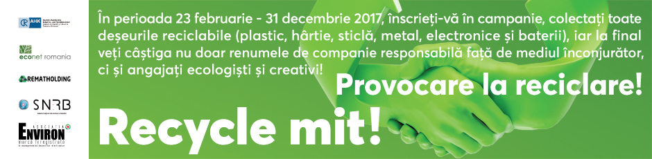 Campania ,,Recycle mit! – Provocare la reciclare!” se desfășoară în perioada 23 februarie – 31 decembrie 2017 și se adresează tuturor firmelor membre AHK România, lansând o invitație la reciclare pentru următoarele tipuri de deșeuri: hârtie/carton, plastic, metal, sticlă, deșeuri de echipamente electrice și electronice (DEEE) și deșeuri de baterii și acumulatori (DBA). Toți participanții în campanie vor primi kit-uri dedicate colectării selective a DEEE și DBA, având la dispoziție formulare online pentru solicitări de înscriere, preluare a deșeurilor și serviciul de Call Center la 031.827.0000 pentru informații suplimentare referitoare la derularea campaniei.