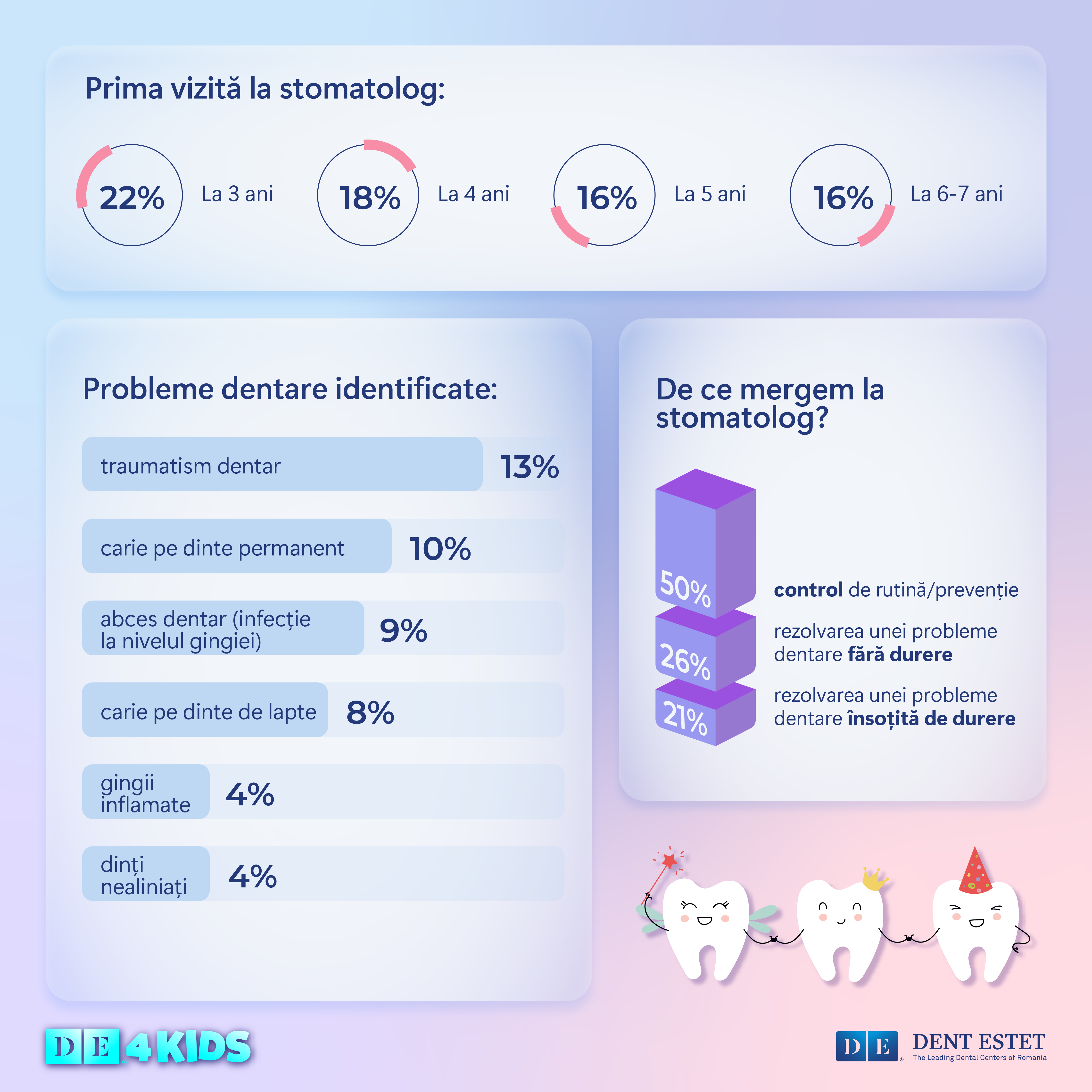 După aproape două decenii de eforturi susținute în educația orală timpurie, rezultatele încep să se vadă: frica de dentist este înlocuită tot mai des de curiozitate, iar controalele de rutină devin tot mai frecvente. Totuși, un studiu recent realizat de DENT ESTET 4 KIDS, parte a Grupului DENT ESTET, arată că mai este încă un drum lung de parcurs în ceea ce privește educația privind importanța prevenției timpurii și combaterea miturilor despre sănătatea orală. Doar 2 din 10 copii merg la primul control stomatologic înainte de 3 ani, iar jumătate ajung la cabinet pentru tratarea unei afecțiuni dentare.