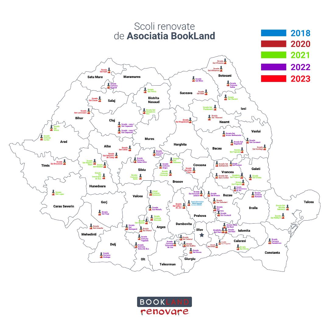 Cu strict materiale de construcții și bani adunați din mediul de afaceri privat, dar și mobilizând autoritățile și comunitățile locale, în doar 3 ani, Asociația BookLand a renovat 67 școli în mediul rural, creând condiții excelente pentru 15.000 elevi / an. Anul acesta sunt în curs de renovare încă 9 școli.