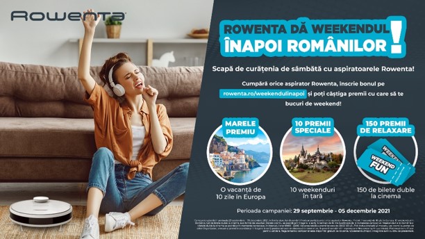 Pentru amintiri de neuitat și zile memorabile, intră în campania Rowenta – cumpară orice aspirator Rowenta până pe 5 decembrie 2021, înscrie bonul/factura pe https://www.rowenta.ro/weekendulinapoi, iar noi îți spunem dacă ai câștigat unul dintre premiile care îți schimbă weekend-ul!
