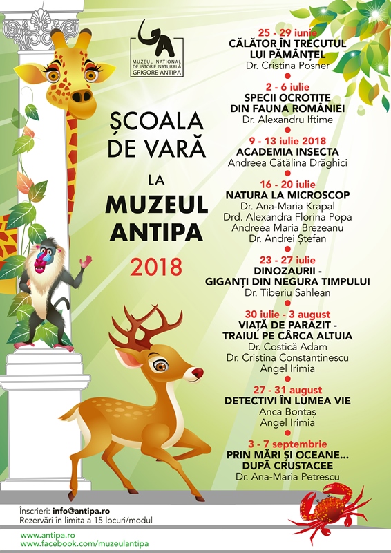 Muzeul Național de Istorie Naturală „Grigore Antipa” îi invită pe copiii cu vârste cuprinse între 9 și 14 ani la o fascinantă călătorie în lumea cunoașterii științifice! Din 25 iunie până pe 7 septembrie 2018, urmând cursurile Școlii de Vară de la Antipa, cei mici vor fi implicați în activităţi de cunoaştere a biodiversităţii şi de ocrotire a mediului, prin însuşirea şi experimentarea practicilor utilizate de către cercetătorii care profesează în domeniul ştiinţelor zoologice.