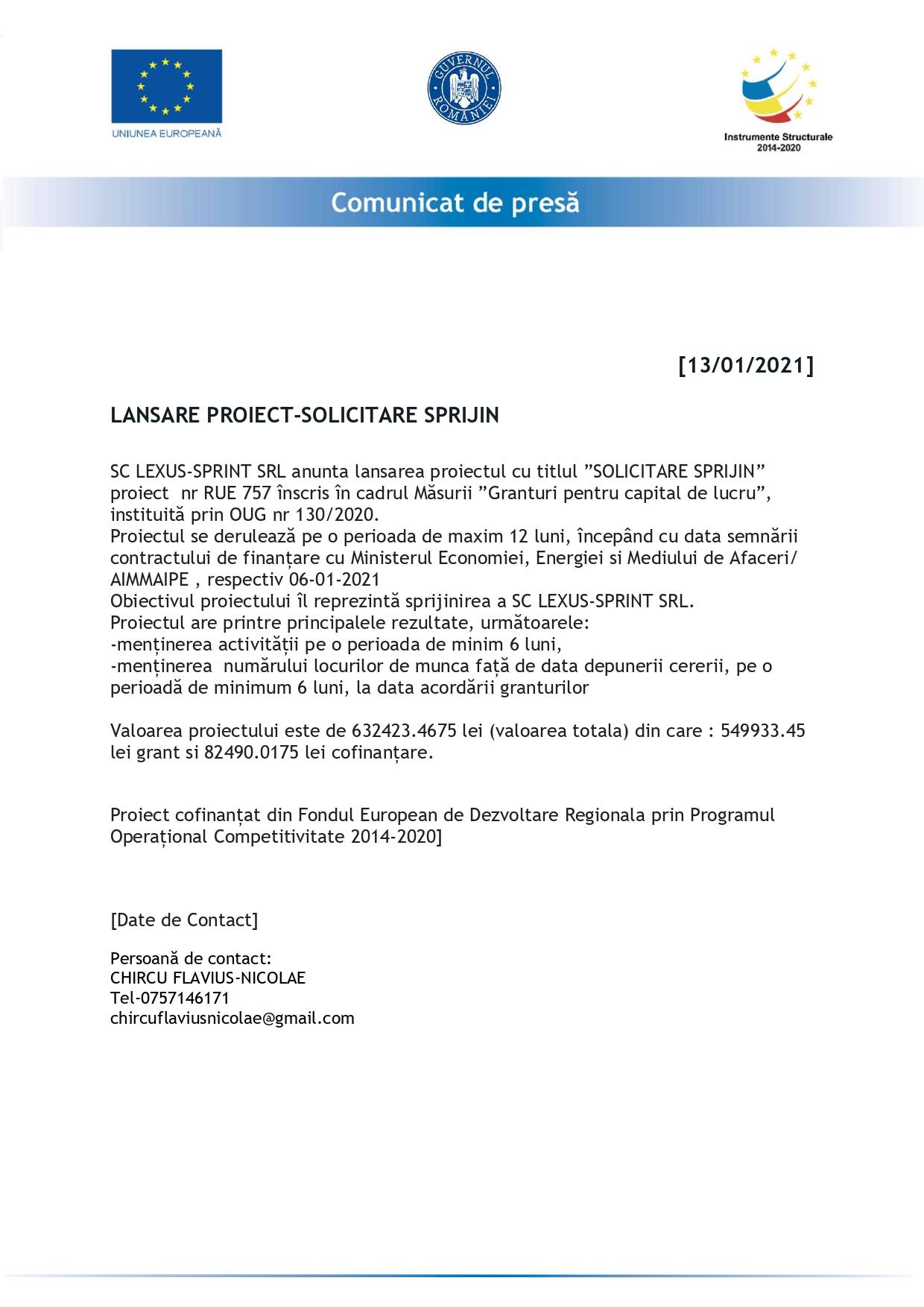 SC LEXUS-SPRINT SRL anunta lansarea proiectului cu titlul SOLICITARE SPRIJIN-GRANTCAPITAL DE LUCRU MASURA 2, contract de finantare nr M2-757,inscris in cadrul Masurii Granturi pentru capital de lucru, instituita prin OUG NR 130/2020.