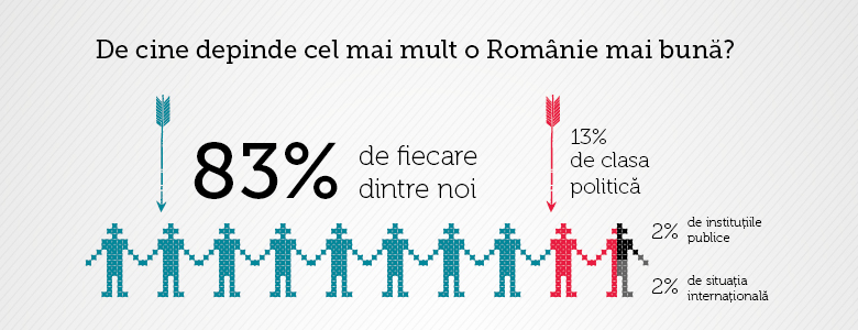 Dintre aceștia, 83% consideră că o Românie mai bună depinde de fiecare dintre noi, 13% văd răspunzătoare clasa politică, iar câte 2% au menționat instituțiile publice și situația internațională ca factori decisivi.