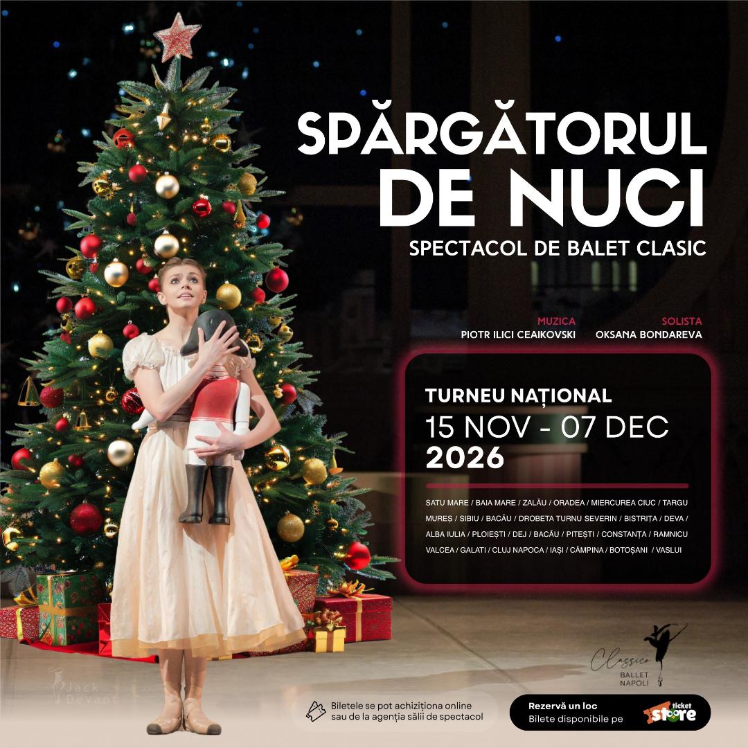 Atmosfera sărbătorilor de iarnă se împletește cu eleganța baletului clasic printr-un turneu spectaculos al celebrului balet „Spărgătorul de Nuci”, desfășurat în perioada 15 noiembrie – 15 decembrie 2026, în mai multe orașe din țară.