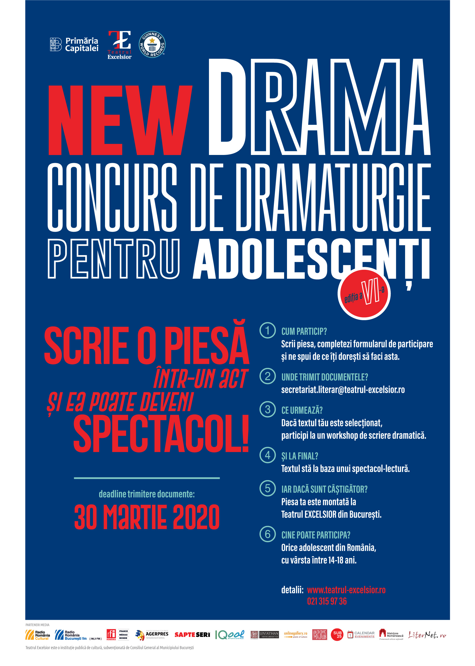 Teatrul EXCELSIOR organizează în perioada ianuarie – octombrie 2020 cea de-a șasea ediție a Concursului de Dramaturgie NEW DRAMA, dedicat adolescenților cu vârste cuprinse între 14 și 18 ani.
