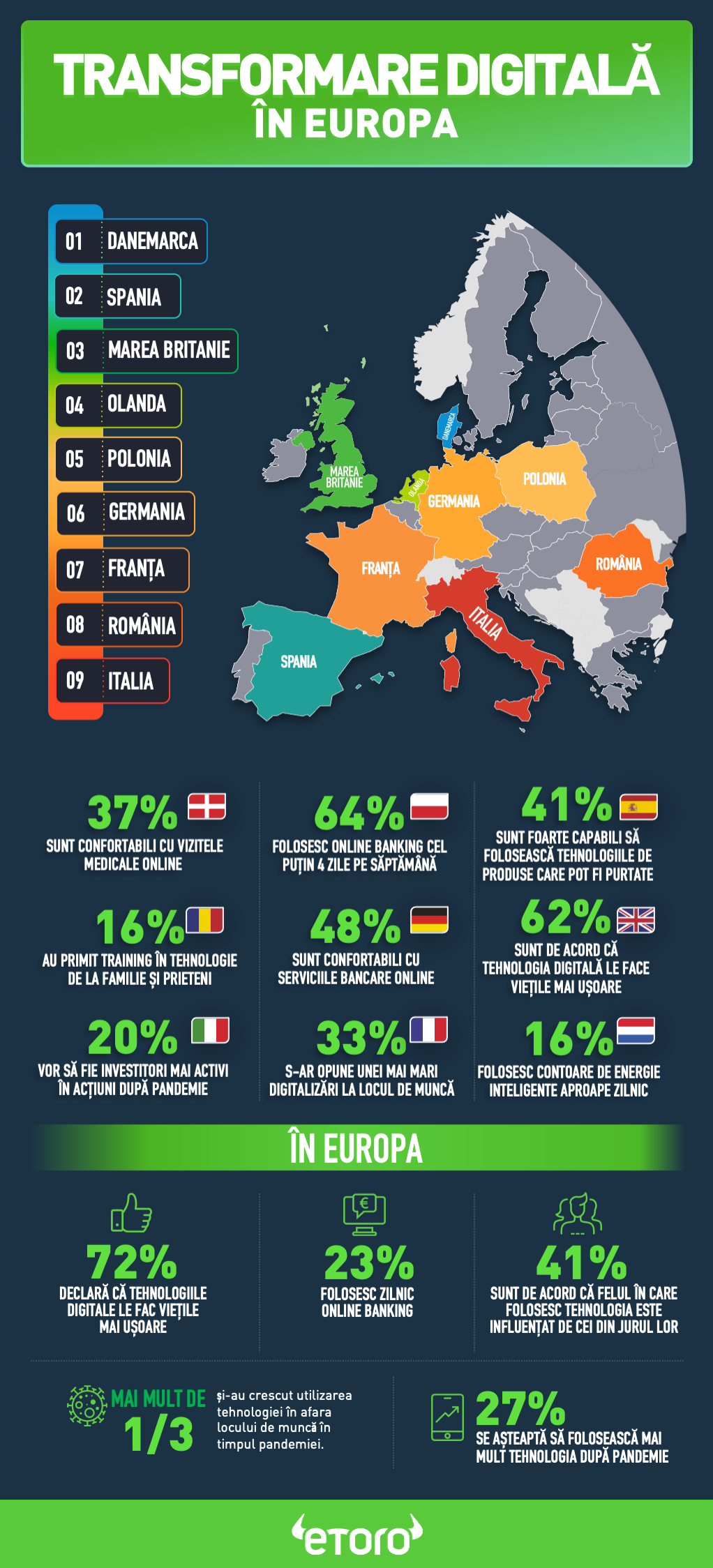 Indicele eToro de Transformare Digitală evaluează nivelul de penetrare a tehnologiei digitale, interacțiunea și potențialul din nouă țări europene (Danemarca, Franța, Germania, Italia, Olanda, Marea Britanie, Polonia, România și Spania) prin incorporarea unei varietăți de indicatori privind situația actuală și cea din viitorul probabil. Indicele Transformării Digitale este format prin combinarea scorului fiecărei țări cu Indicii de Interacțiune Digitală și de Creștere Digitală.