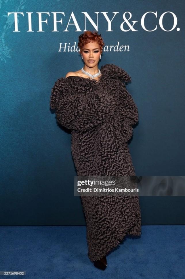 Teyana a purtat o ținută din colecția de toamnă 2025 Calvin Klein Collection, constând într-o haină din organza cu volane, lungă până la glezne.