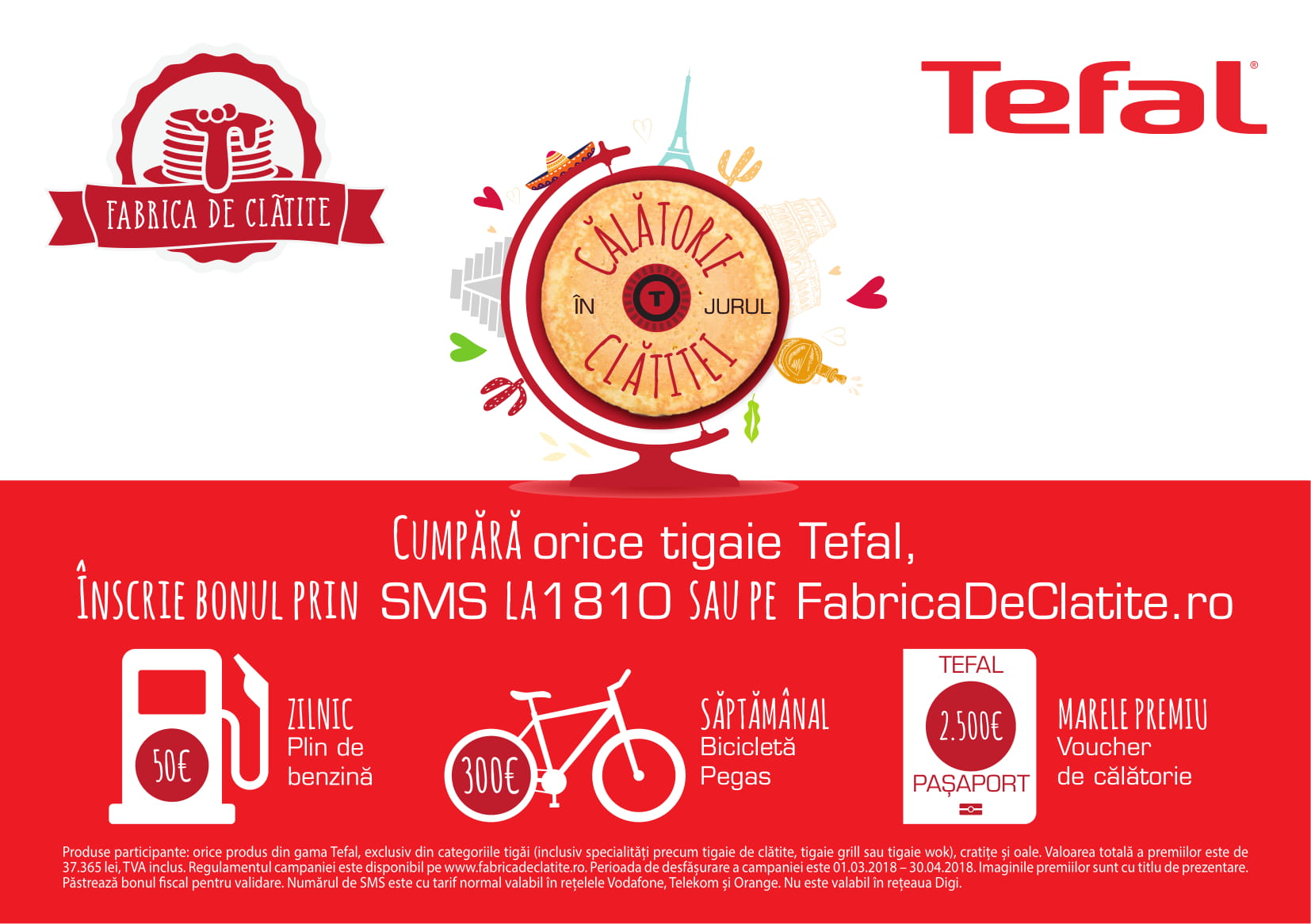 Achiziționează orice tigaie, cratiță sau oală Tefal, înscrie bonul prin sms la numărul 1810 sau pe fabricadeclatite.ro până pe data de 30 aprilie și poți câștiga zilnic un plin de benzină, săptămânal o bicicletă Pegas sau marele premiu, un pașaport de călătorie de 2500 de euro, ca să mergi oriunde îți dorești în lume.