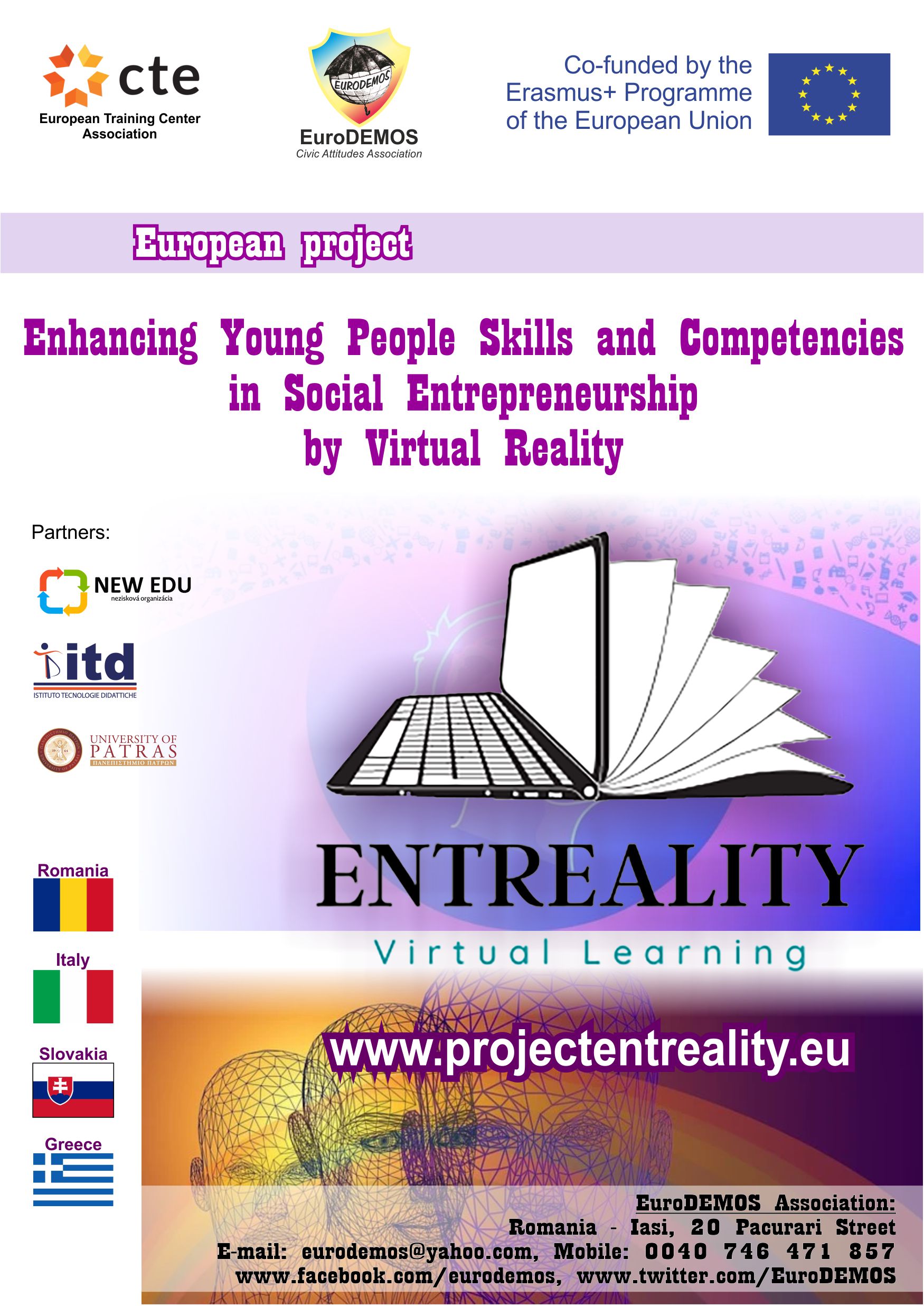 Proiectul Îmbunătățirea abilităților și competențelor tinerilor în antreprenoriatul social prin realitate virtuală – ENTREALITY își propune să contribuie la dezvoltarea competențelor antreprenoriale a tinerilor printr-un mediu educațional virtual 3D inovator. Proiectul își propune să răspândească experiențele acumulate în cadrul unor proiecte anterioare și să integreze noile tehnologii și metodologii de învățare în lumea 3D, inclusiv abordările de social media și gamification.