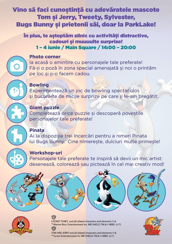 Intre 1 si 4 iunie, ParkLake Shopping Center aduce in premiera in Romania celebrele personaje animate Tom si Jerry, Tweety, Sylvester, Bugs Bunny si prietenii sai. Cu ocazia Zilei Copilului, micutii sunt asteptati in centrul comercial sa cunoasca mascotele Warner Bros si sa se bucure de patru zile de distractie si surprize.