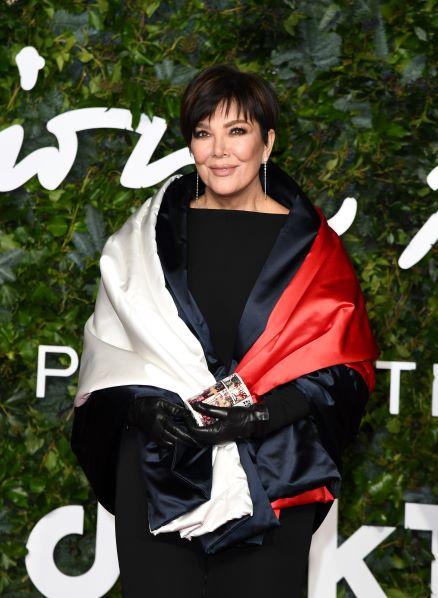 Kris Jenner a purtat un șal din satin de mătase în culorile specifice logo-ului TOMMY HILFIGER, peste o salopetă neagră elegantă, cu un decolteu în linii moderne.
