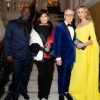 Georgia May Jagger a purtat o foarte lungă jachetă smoking TOMMY HILFIGER din mătase și lână grain de poudre, cu rever din satin, un sutien din satin asortat și o fustă mini cu paiete, în clasicul steag cu logo TOMMY HILFIGER.