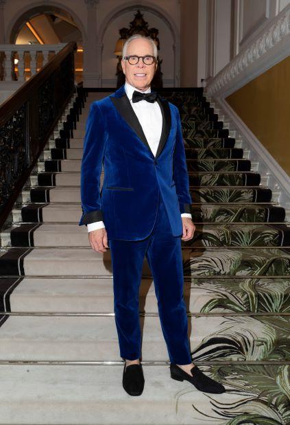 Tommy Hilfiger a purtat un smoking personalizat de catifea albastru ocean TOMMY HILFIGER x Denis Frison, realizat manual în Italia, dintr-o țesătură special realizată pentru brand, cu manșete grosgrain de mătase și căptușeală de mătase roșie, asortat cu o cămașă albă TOMMY HILFIGER. Pantalonii cu talie înaltă au avut căptușeală Oxford cu semnătură brand-ului.