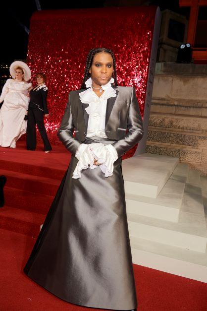 Indya Moore a purtat o rochie TOMMY HILFIGER din jerseu și crepon roșu, cu un drapaj romantic, peste o bustieră de catifea roșie.