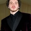 Jack Harlow a purtat un sacou tuxedo TOMMY HILFIGER, croit din catifea în dungi roșu închis și bleumarin, cu închidere dublă, butoni acoperiți, revere din mătase neagră, și pantaloni tuxedo cu dungi de culoare roșie și bleumarin, cu detalii dungi laterale de mătase, și o cămașă din bumbac negru.