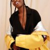 Jeremy O. Harris a purtat o jachetă regatta TOMMY HILFIGER, lungă până în podea, împrumutând din aerul costumelor de operă, în culoarea galben păpădie, căptușită cu folie argintie, cu buzunare și detalii tehnice inspirate din îmbrăcămintea pentru navigație, pantaloni cu cu talie înaltă, personalizată cu logo-ul brand-ului, realizați dintr-un mix de mătase și lână bleumarin, și o cămașă din bumbac, aceeași culoare, purtată înfășurat.