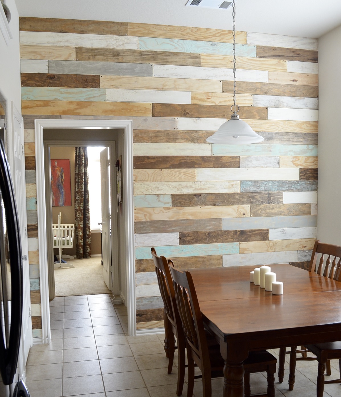 Mai departe, la ultimul pas putem apela la simple sipci din lemn sau cherestea pe care le putem vopsi in diverse culori, chiar si albe si sa decoram un perete sau peretele din spatele televizorului sau a canapelei.