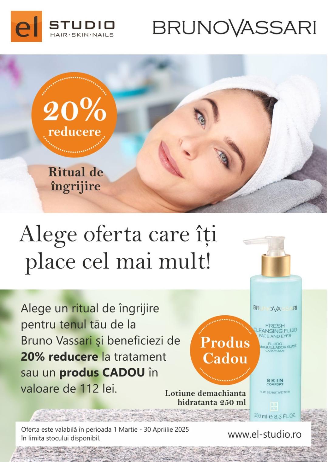 Până la finalul lunii aprilie, în saloanele El Studio găsești o promoție exclusivă pentru toate iubitoarele de îngrijire premium: -20% la orice tratament Bruno Vassari SAU un cadou special – un produs Bruno Vassari. Alegerea îți aparține!